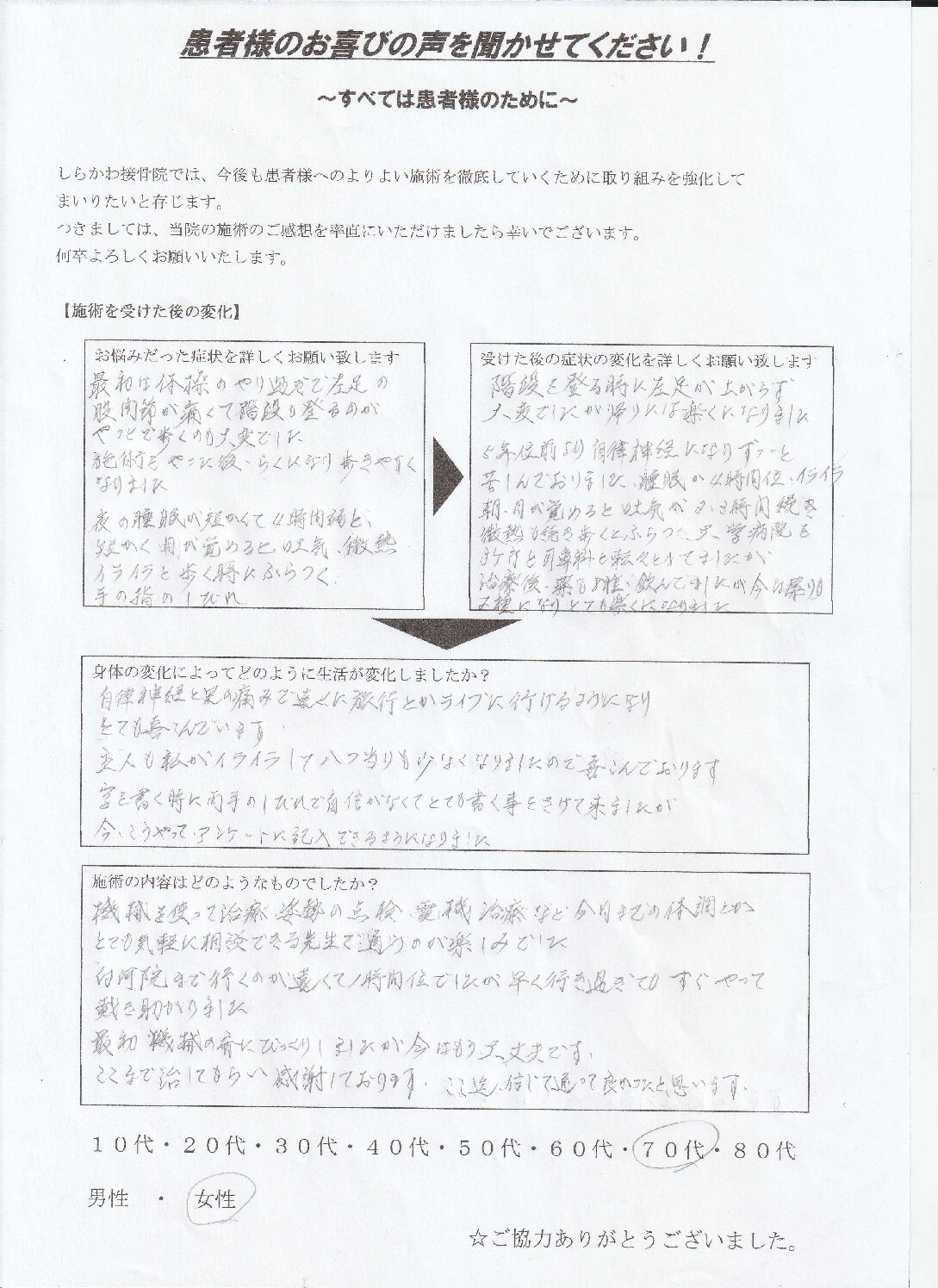 O.S様 70代 女性 ①不眠症 ②股関節痛